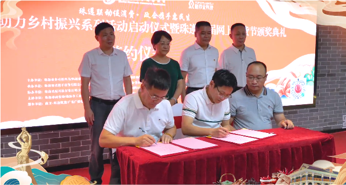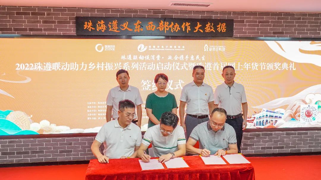 在珠海市委网信办互联网行业党委专职副书记吴鲜、珠海市驻遵义工作组副组长王保喜、珠海市乡村振兴局副局长肖劲松与珠海市总工会四级调研员张罗灿的见证下,珠海市菜篮子投资有限公司与珠海澳佰伴进出口贸易有限公司、珠海远大美业生物科技有限公司、老钟驾到、超人妈妈顺利签下合作协议。助力“黔货出山”和“遵品入珠”。聚力将珠海、遵义100余家生产企业、近500款特色产品通过20多家社交电商、直播、社群等新媒体、新直播账号进行线上下单,线下配送销售。